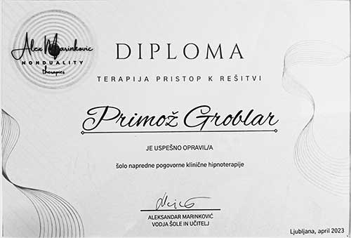Ker me je njegov pristop fasciniral sem se vpisal v šolo napredne pogovorne klinične hipnoterapije, ki jo vodi Aleksandar. Tam sem se naučil, da gre pri njegovem pristopu za več kot tehnike – gre za prepoznavanje naše lastne esence brez ločenosti med klientom in terapevtom. Ta proces prepoznavanja v terapiji presega vse tehnične pristope in prinaša globoko osvoboditev, kar je tudi pokazatelj, da je to popolnoma nov pristop, ki je v biti popolnoma drugačen od vsega do sedaj videnega.